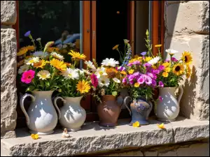 Kolorowe, Dzbanki, Parapet, Okno, Kwiaty