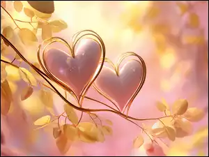 Różowe, Serca, Grafika AI, Dwa, Liście, Żółte, Gałązka