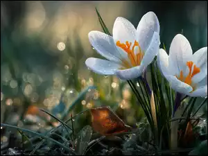 Krokusy, Białe, Trawa, Grafika AI, Kwiaty, Krople
