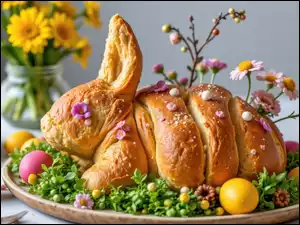 Królik, Chleb, Stół, Wielkanoc, Taca, Jajka, Kwiaty