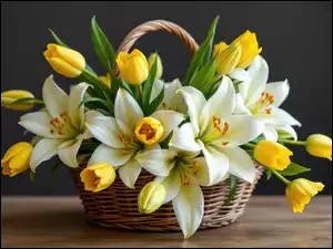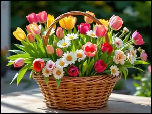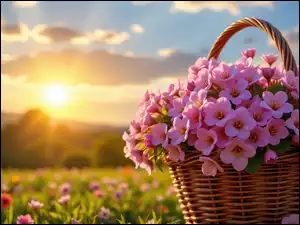 Kwiaty, Koszyk, Kolorowe, Rozświetlone, Wiklinowy